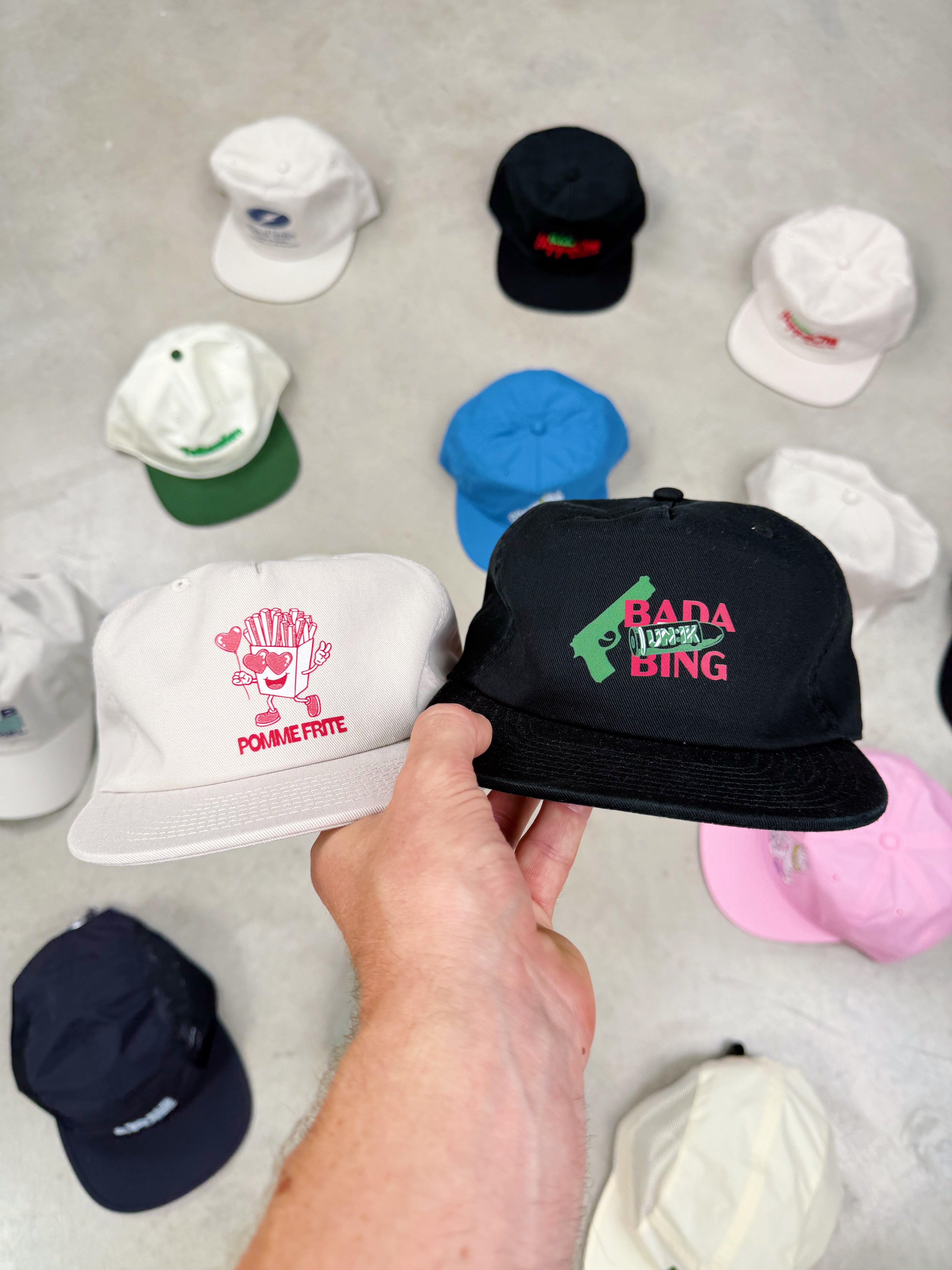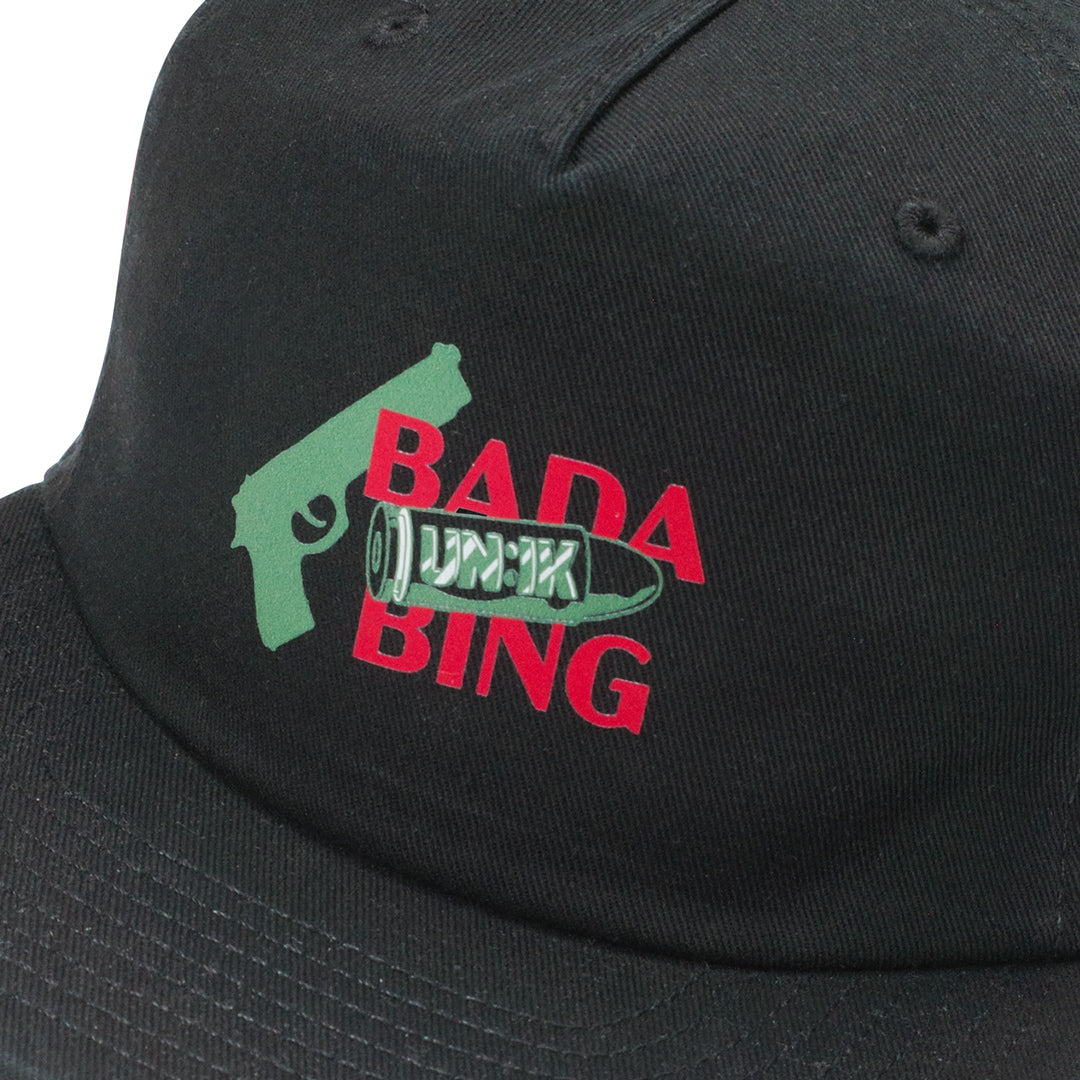 Our most loved cap shape, in the premium heavy cotton twill canvas fabric, with the new frontal Bada Bing x UN:IK logo, for the best collab in Manchester.