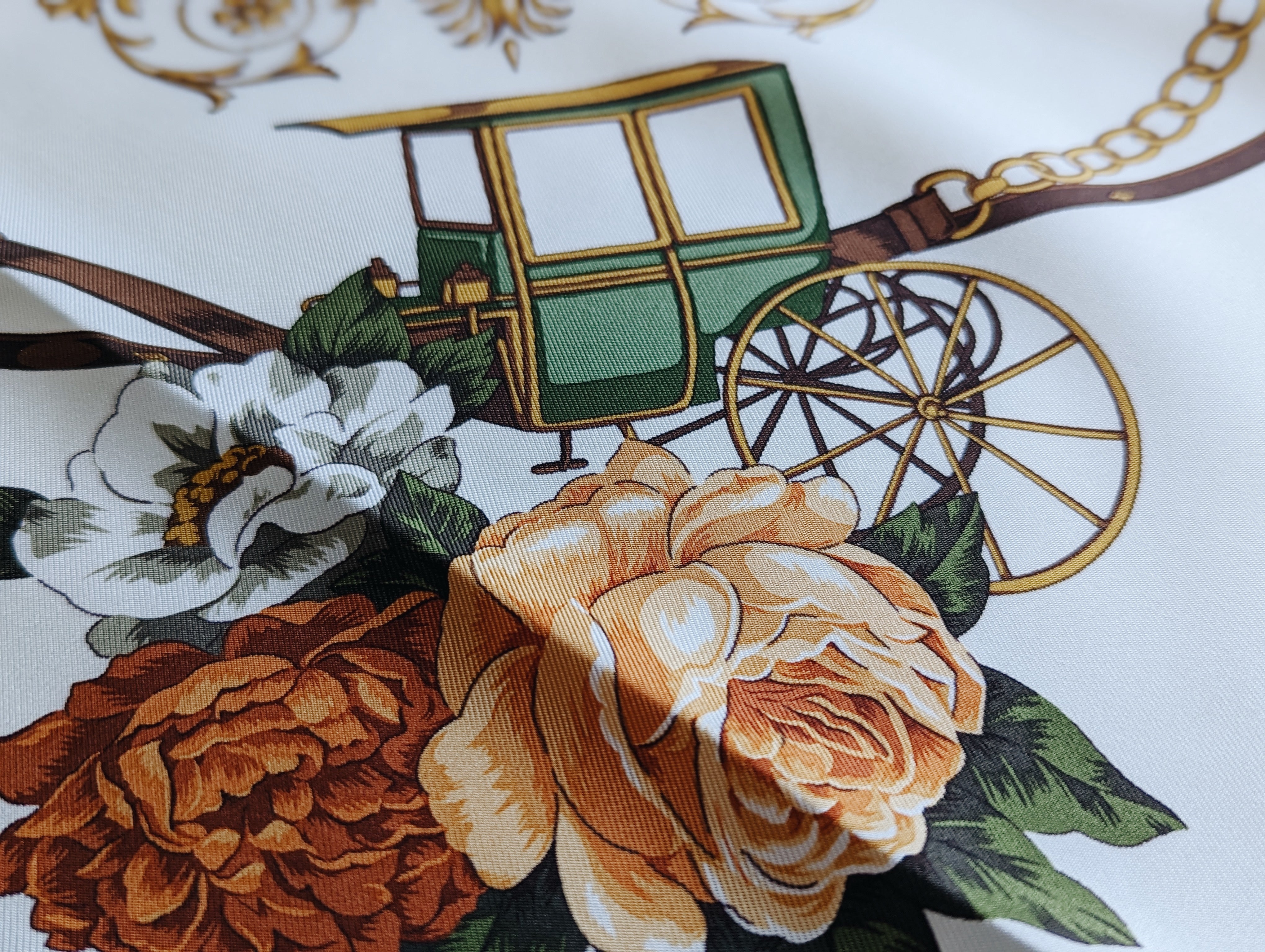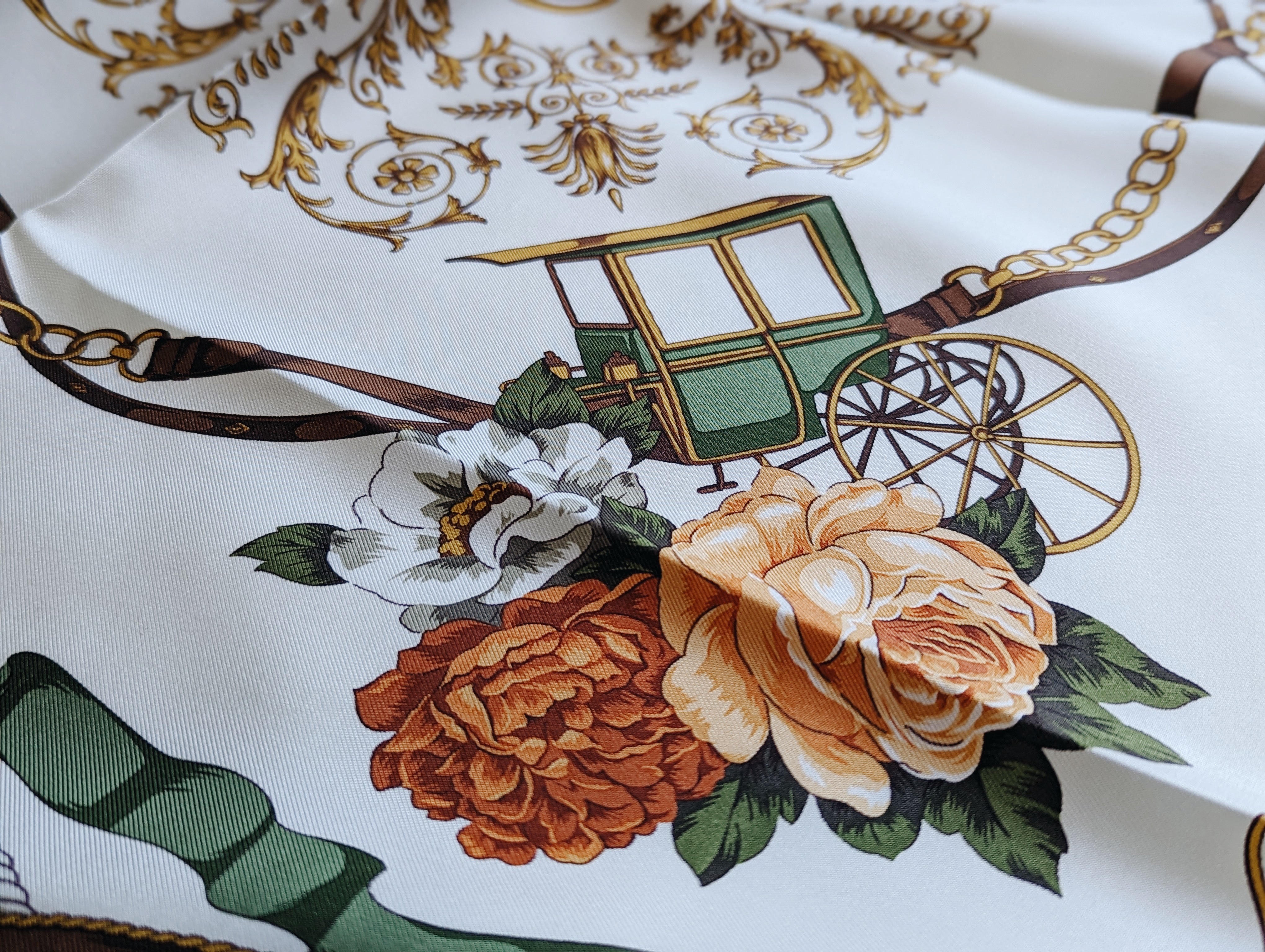 It is a silk scarf made with a technique called "tenassen." Tassen is a printing method in which the dye is poured onto a mold and then dyed one color at a time by hand. The delicate and careful process gives a sharp finish to the fine patterns.