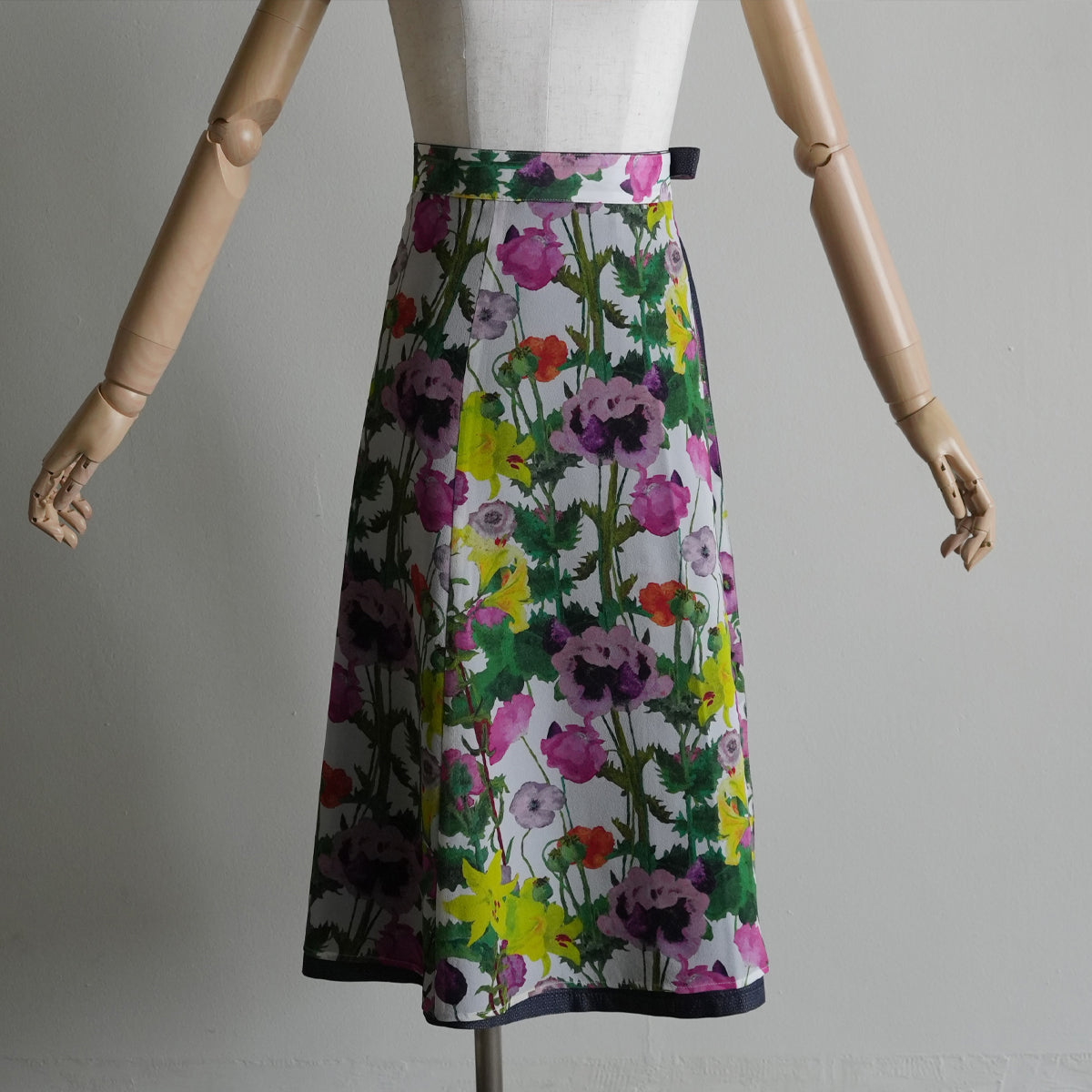 A flared reversible skirt with dead stock kimono fabric and dead stock Italian silk.